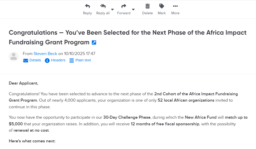“Out of nearly 4,000 applicants, your organization is one of only 52 local African organizations invited to continue in this phase,” Beck wrote. “You now have the opportunity to participate in our 30-Day Challenge Phase, during which the New Africa Fund will match up to $5,000 that your organization raises.”
